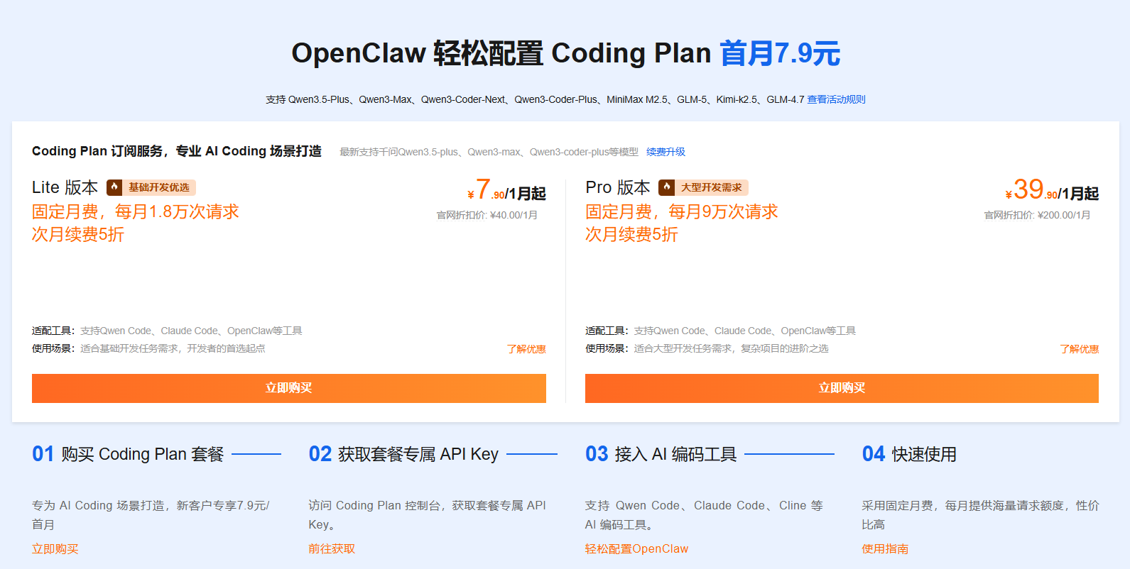 支持 Qwen3.5-Plus、Qwen3-Max、Qwen3-Coder-Next、Qwen3-Coder-Plus、MiniMax M2.5、GLM-5、Kimi-k2.5、GLM-4.7