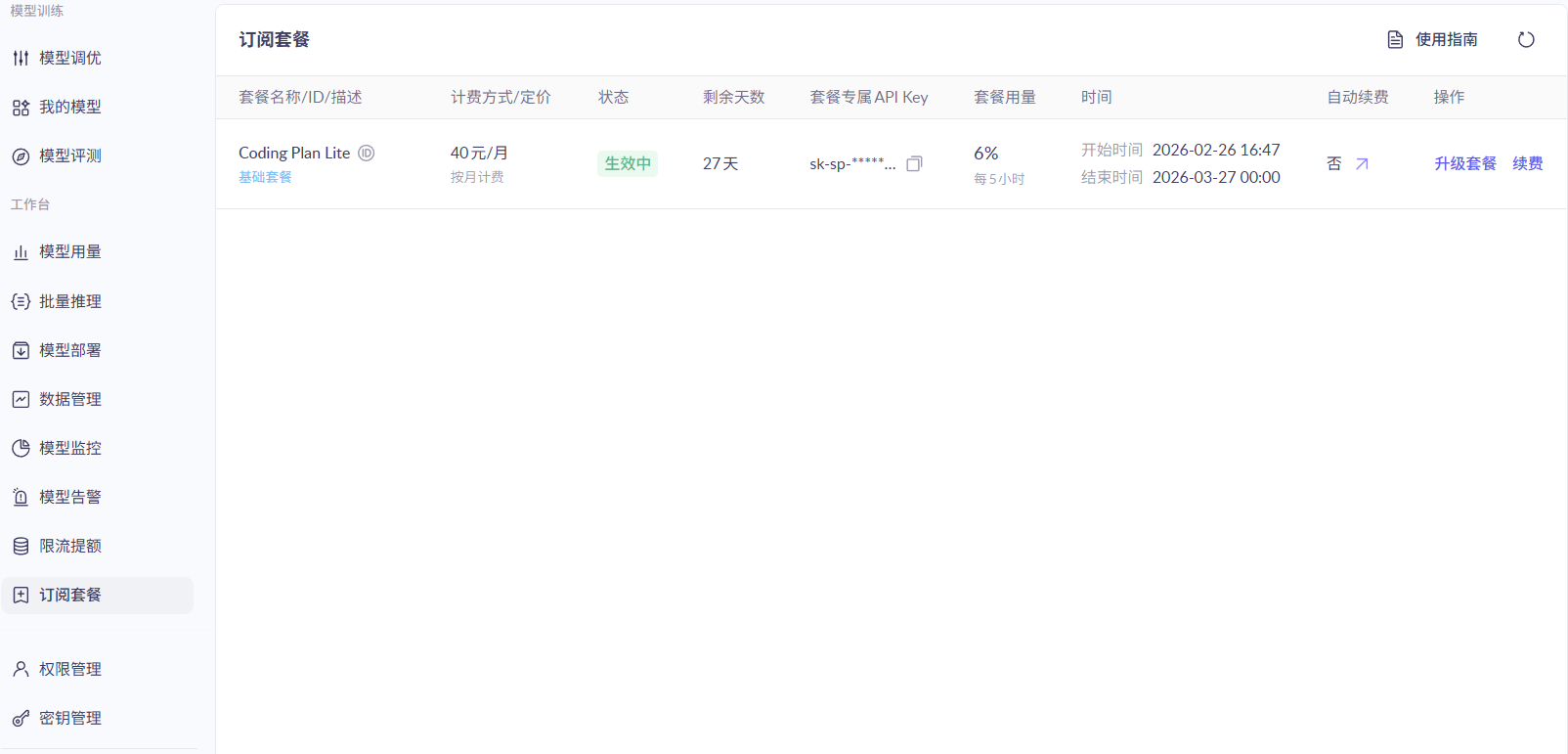 购买之后进入阿里云百炼大模型的后台服务,因为阿里云服务非常的多需要找到Code Plan控制台,模型服务后台网址[https://bailian.console.aliyun.com/cn-beijing/?spm=a2c4g.11186623.0.0.9b684c4dqbiaaQ&tab=model#/efm/coding_plan]