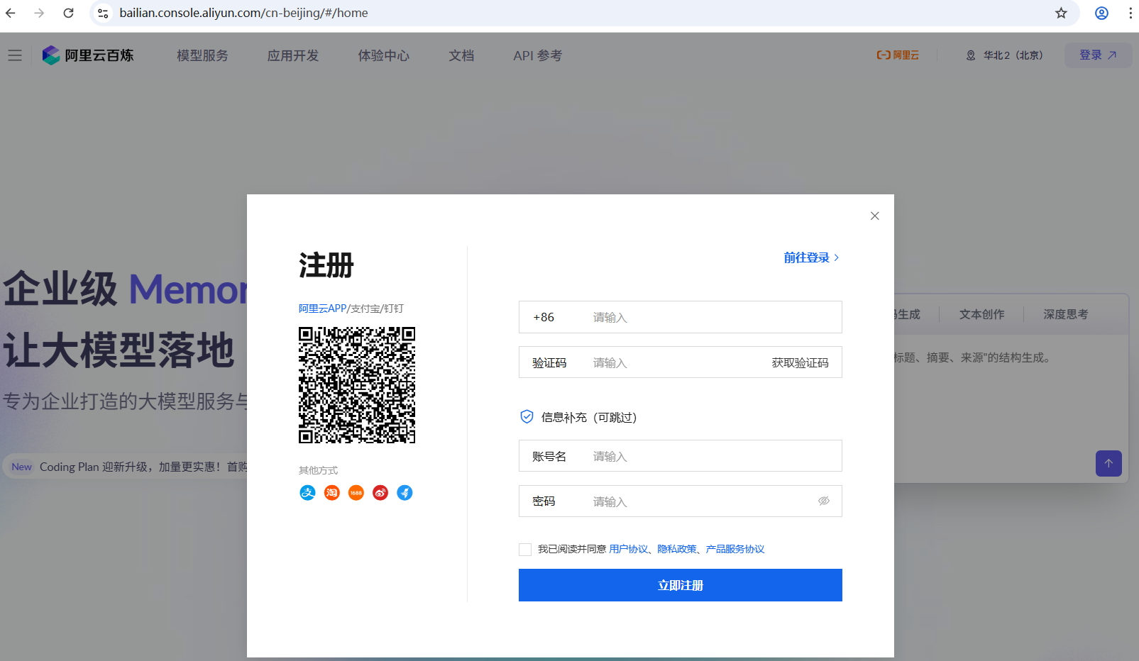 登录网页,进行注册,因为是阿里集团下的所以可以直接支付宝、淘宝,1688,钉钉等直接登录