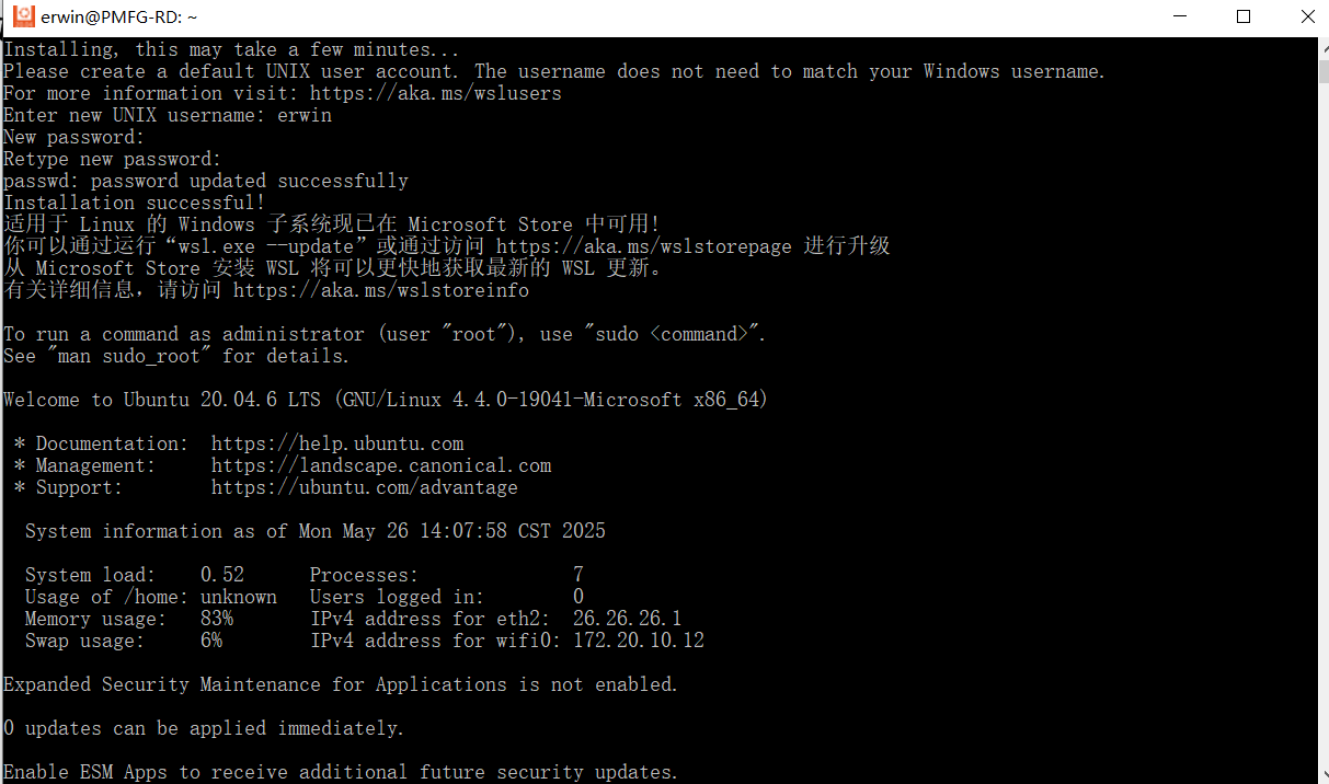echo -e "[user]\ndefault=erwin" >> /etc/wsl.conf更改之后,需要重启wsl,才能生效