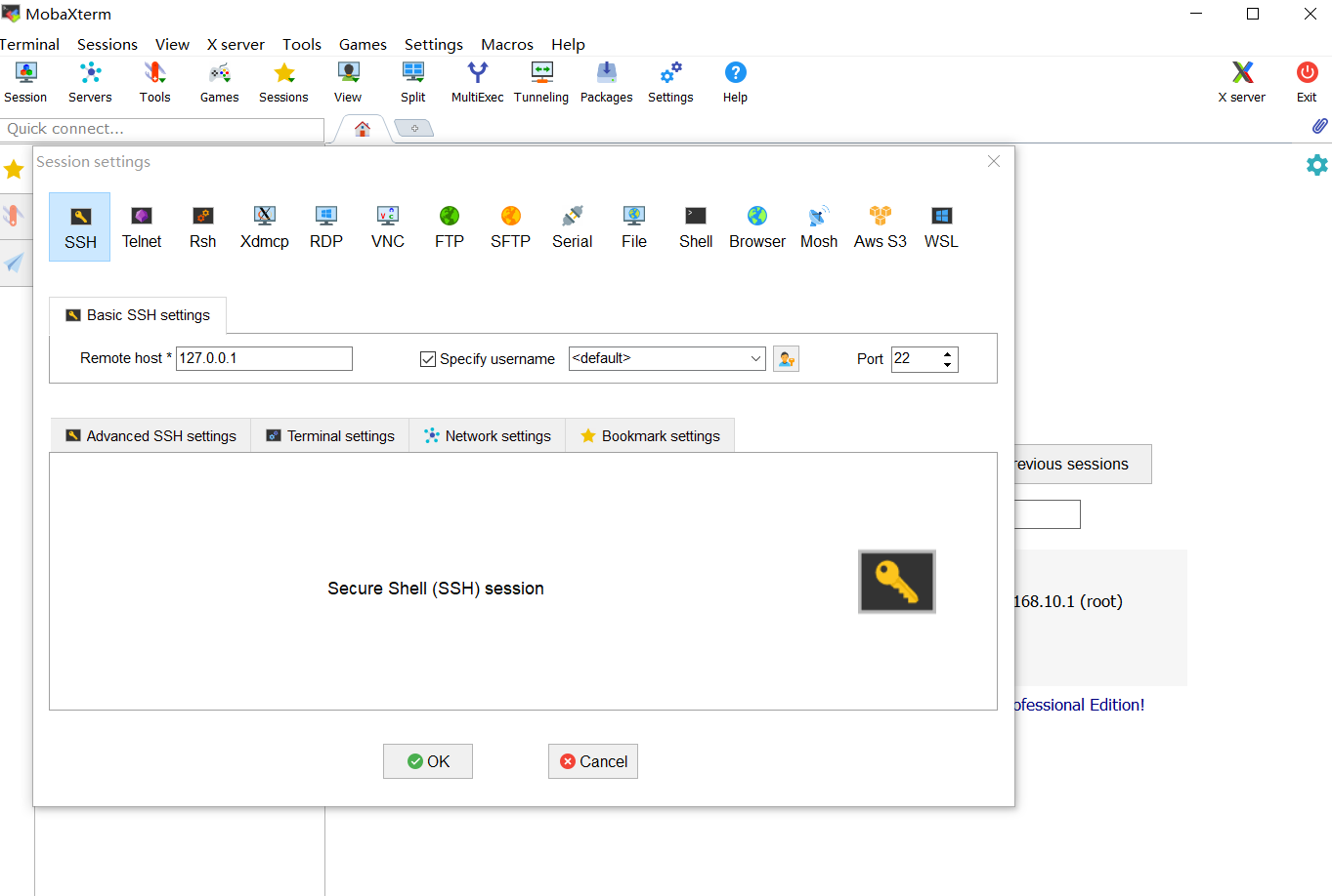 按照下图选择Session—-SSH—-Remote host输入(127.0.0.1)—-Specify username输入自己之前设置的Unix name—-点击OK,就提示输入密码即可进入终端