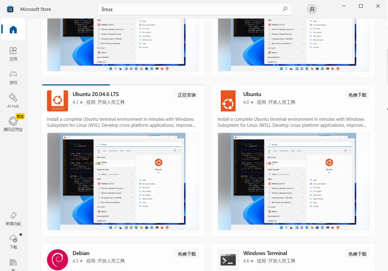 在Windows中搜索Microsoft Store, 点击进入界面,可以搜索Ubuntu或者Linux,会出来不同版本的Ubuntu Figure 2, 这里选择的是Ubuntu20.04 LTS版本,点击下载等待即可。