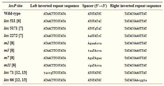 Cre重组酶识别的回文DNA位点,也叫loxP (locus of X-over P1) 位点,长 34bp,其特征结构为ATAACTTCGTATA -NNNTANNN-TATACGAAGTTAT,方向是5‘-3’。两边反向互补的13个碱基为Cre重组酶的识别序列,中间的8个碱基为重组发生位置,这也决定了loxP的方向。N表示可变碱基,不同的碱基选择可形成不同的 Lox位点。