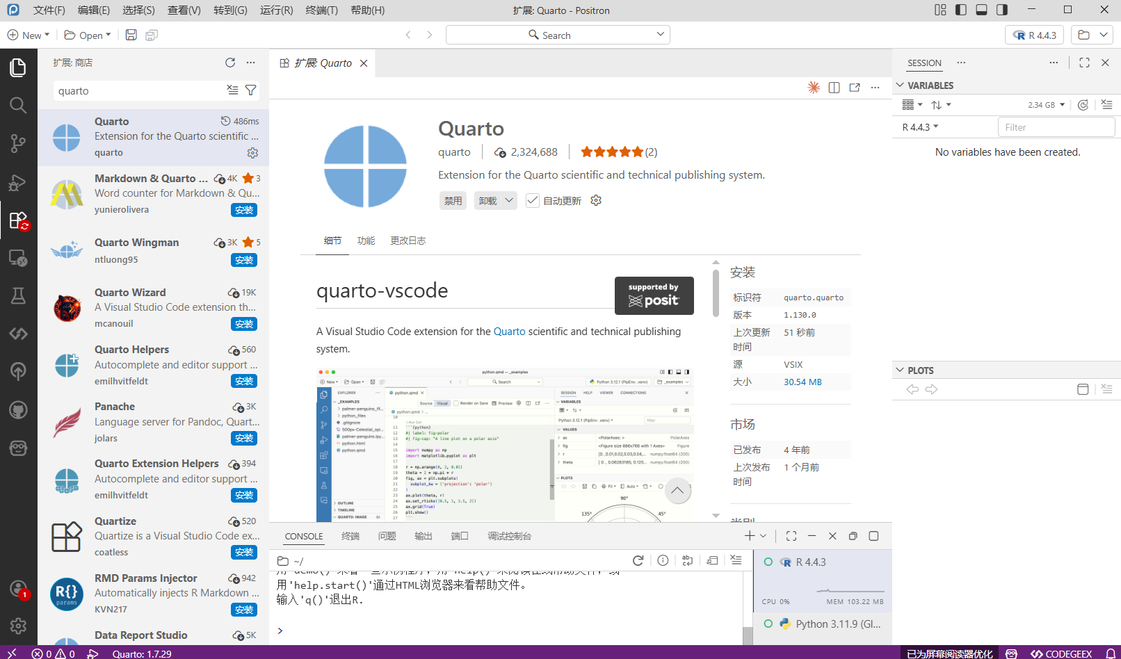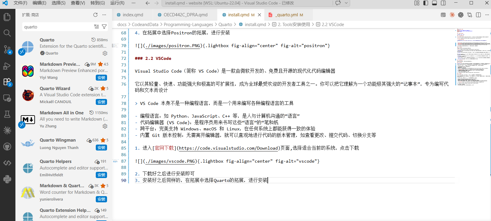 - 安装好之后同样的,在拓展中选择Quarto的拓展,进行安装